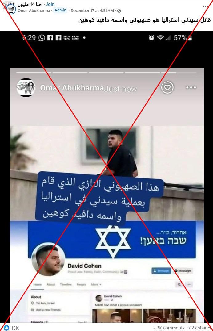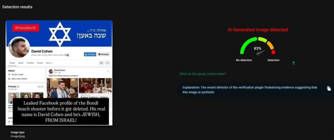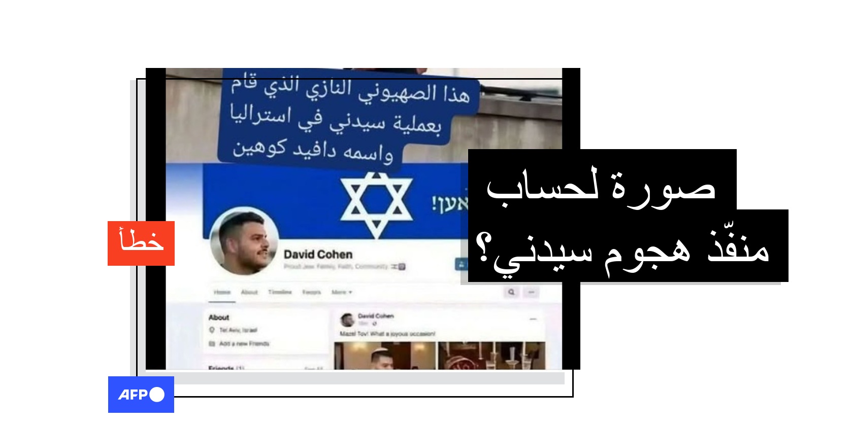بعد أيام من هجوم ضد تجمّع لليهود في 14 كانون الأول/ديسمبر على شاطئ بونداي في سيدني أسفر عن مقتل 15 شخصاً، تداول مستخدمون لمواقع التواصل الاجتماعي صورة زعم ناشروها أنّها تثبت أنّ منفّذ الهجوم إسرائيلي يدعى ديفيد كوهين. إلا أنّ الصورة في الحقيقة تحمل علامات تشير إلى أنّها مولّدة باستخدام الذكاء الاصطناعي، أمّا المتّهمان بتنفيذ الهجوم هما نافيد أكرم ووالده ساجد الذي قتل أثناء الهجوم.