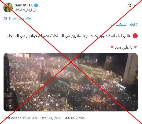 فرضت السلطات السورية الثلاثاء حظر تجول ليلي في مدينة اللاذقية غداة أعمال عنف طالت أحياء ذات غالبية علوية. في هذا السياق تداول مستخدمون لمواقع التواصل الاجتماعي فيديو زعم ناشروه أنّه لتظاهرات في لواء اسكندرون (منطقة هاتاي التركية) تضامناً مع العلويين. إلا أنّ الفيديو يعود في الحقيقة لتظاهرة تاريخيّة ضدّ الفساد شهدتها العاصمة الصربيّة بلغراد في أيّار/مايو 2025.