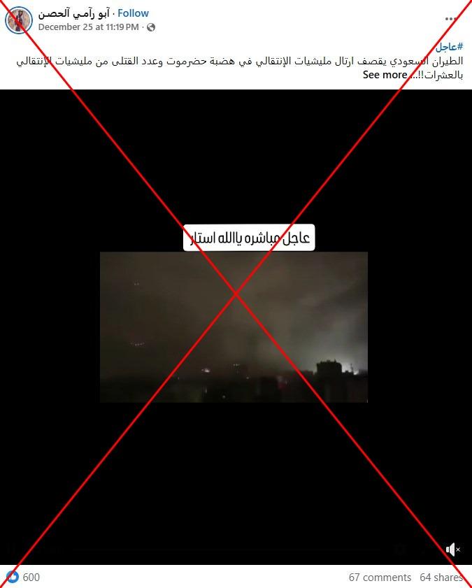 وجاء في التعليق المرافق أنّ المشهد يظهر قصف الطيران السعودي لقوات الانتقالي الجنوبي في محافظة حضرموت شرق اليمن.