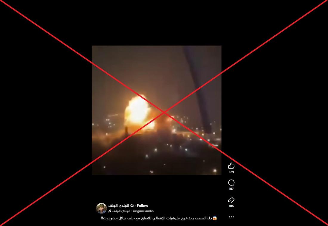 تظهر في الفيديو انفجارات هائلة في مدينة ليلاً. وجاء في التعليقات المرافقة أن الفيديو يصوّر قصفاً على حضرموت.