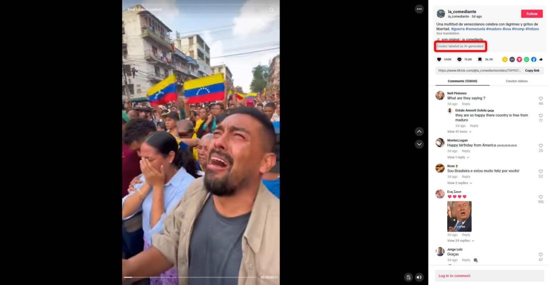 ونُشر الفيديو بتاريخ الثالث من كانون الثاني/يناير 2026 في حسابٍ على موقع تيك توك وجاء في التصنيف المرافق له أنّه مولّد باستخدام الذكاء الاصطناعيّ.