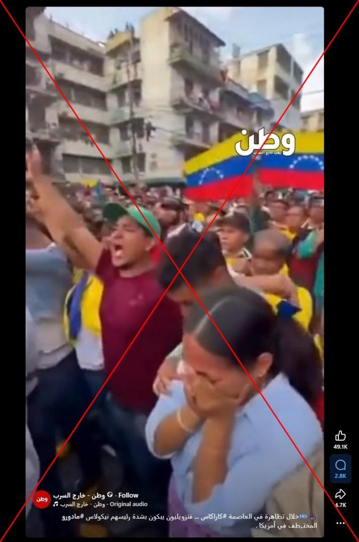 عقب العملية العسكرية الأميركية التي أطاحت الرئيس الفنزويلي نيكولاس مادورو، تداول مستخدمون لمواقع التواصل الاجتماعي فيديو زعم ناشروه أنّه لمتظاهرين مؤيّدين لمادورو في كراكاس. صحيح أنّ العاصمة الفنزوليّة شهدت تحرّكات داعمة لمادورو إلا أنّ هذا الفيديو مولّد باستخدام الذكاء الاصطناعي.