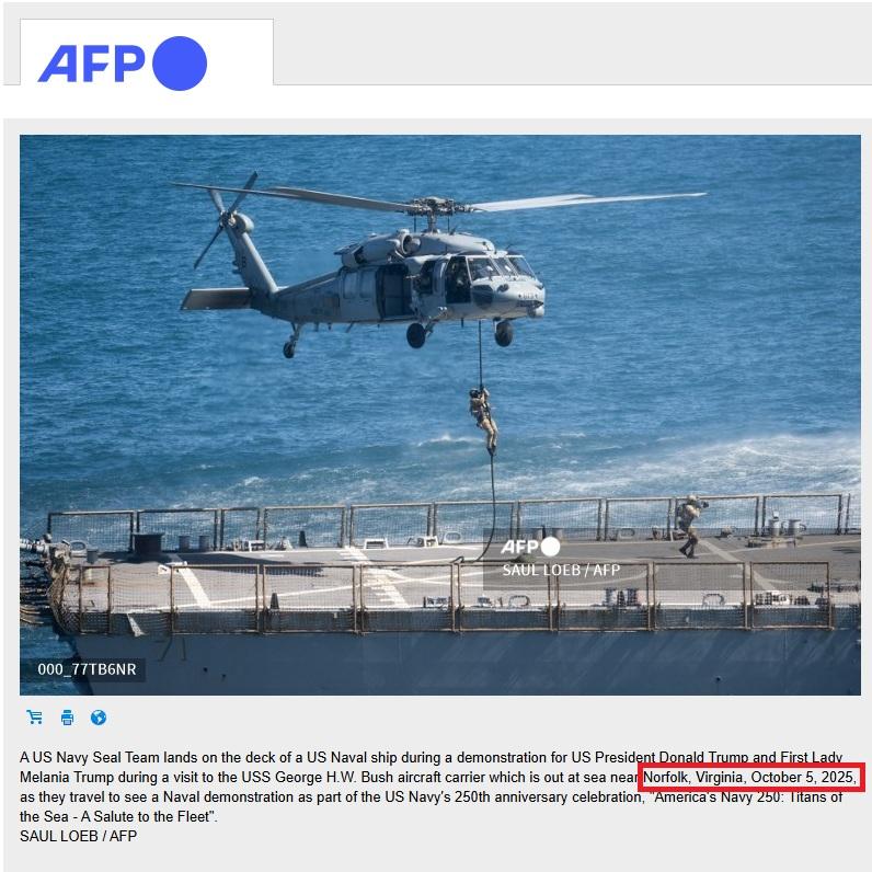 غداة إعلان البيت الأبيض في السابع من كانون الثاني/يناير 2026 احتجاز ناقلة نفط روسية في شمال المحيط الأطلسي، في إطار الحصار الذي تفرضه واشنطن على ناقلات نفط مرتبطة بفنزويلا، انتشر فيديو على مواقع التواصل ادعى ناشروه أنه لإنزال جويّ أميركي على الناقلة. إلا أن الفيديو يظهر عرضاً عسكرياً في تشرين الأول/أكتوبر 2025 خلال احتفال مرور 250 عاماً على تأسيس البحرية الأميركية.