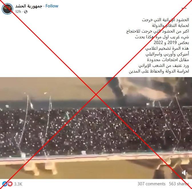 بثّ التلفزيون الإيراني الرسمي في التاسع من كانون الثاني/يناير مشاهد لآلاف الأشخاص يشاركون في تظاهرات مضادة للاحتجاجات الحالية، رافعين شعارات مؤيّدة للسلطات في عدد من المدن الإيرانية. في هذا السياق تداول مستخدمون لمواقع التواصل الاجتماعي فيديو زعم ناشروه أنّه لهذه التظاهرات. إلا أنّ الفيديو في الحقيقة ملتقط خلال تشييع القائد السابق لفيلق القدس في الحرس الثوري الإيراني قاسم سليماني الذي اغتيل بغارة أميركية في بغداد عام 2020.