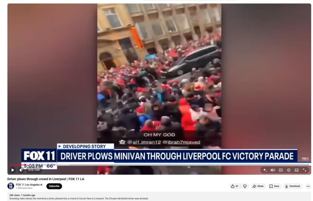 وجاء في التعليقات المرافقة للفيديو أنّه لسائق دهس عمداً مشاركين في احتفالات بفوز نادي ليفربول بالدوري الإنكليزي لكرة القدم.