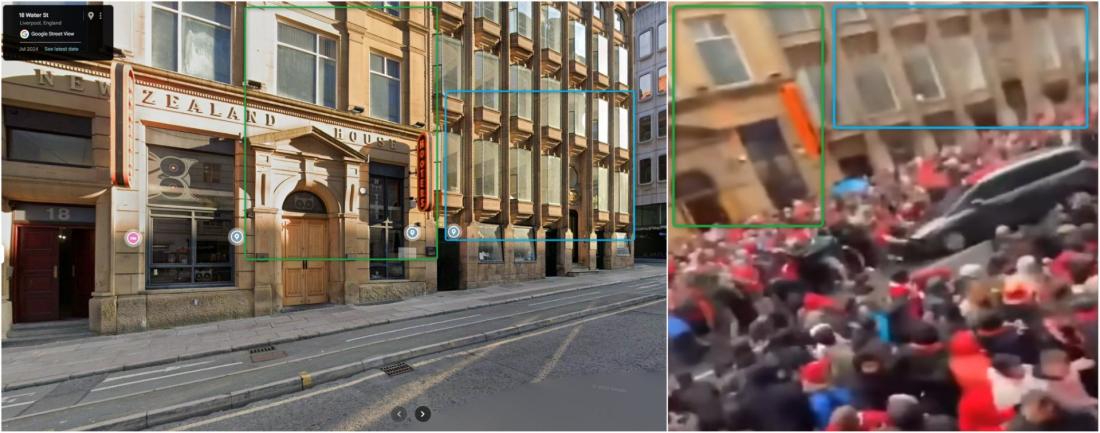 ونشرت مواقع إخباريّة محليّة مشاهد أخرى للحادثة يمكن على ضوئها تحديد مكان تصوير الفيديو في شارع Water Street في مدينة ليفربول بالاستعانة بخدمة خرائط غوغل. (أرشيف 1-2)
