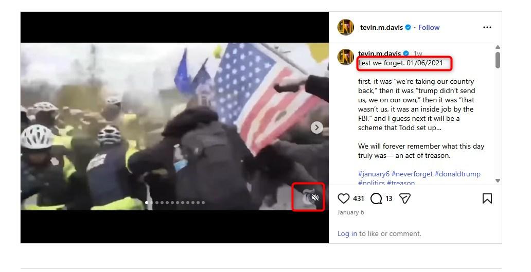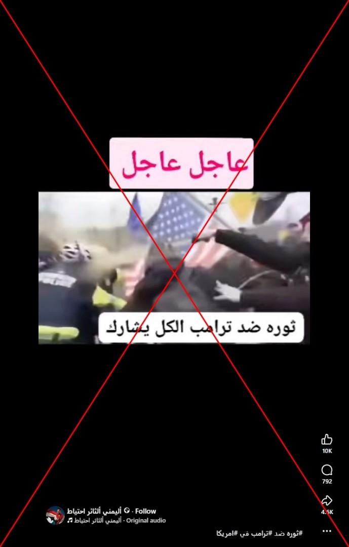 فقد أظهر البحث عن لقطات منه إلى أنّه منشورٌ في حسابات على مواقع التواصل الاجتماعي مع الإشارة إلى أنّه مصوّر عام 2021 خلال اقتحام أنصار ترامب لمبنى الكونغرس في واشنطن. (أرشيف)