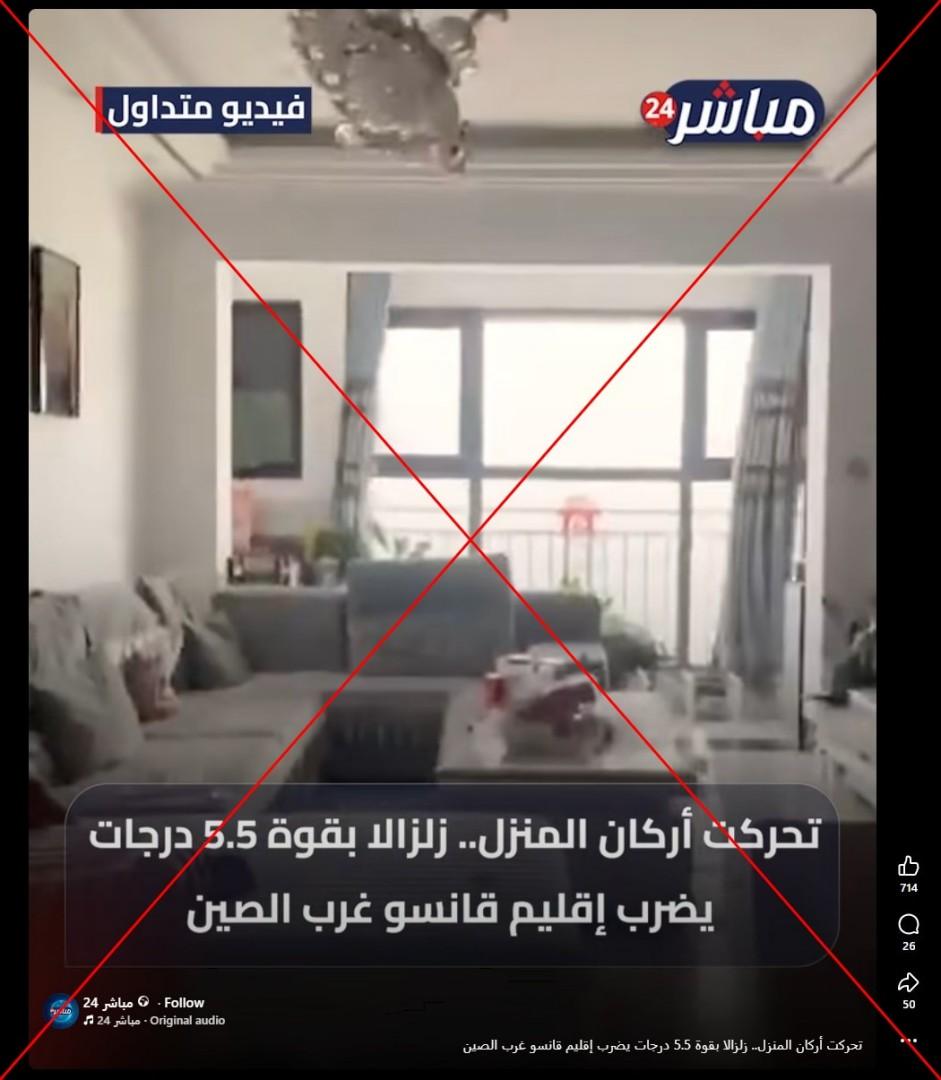 ضرب زلزال بقوة 5.5 درجات إقليم قانسو الواقع في شمال غرب الصين في 26 كانون الثاني/يناير، بحسب ما أفاد مركز شبكات الزلازل الصيني. عقب ذلك، تداول مستخدمون لمواقع التواصل الاجتماعي فيديو زعموا أنّه للحظة وقوع الزلزال. إلا أنّ الفيديو في الحقيقة يعود للزلزال المدمّر الذي ضرب بورما في آذار/مارس 2025.