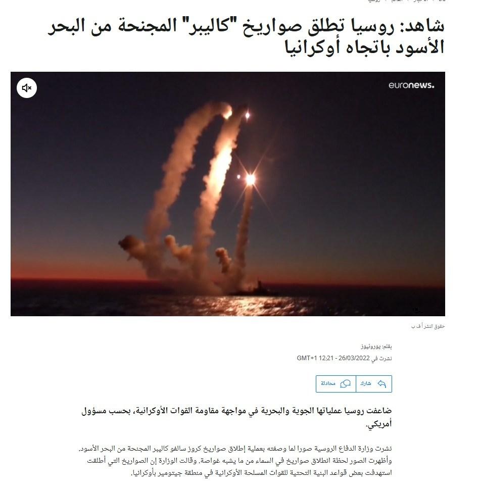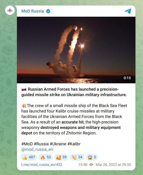 وذكرت وزارة الدفاع الروسيّة أن صواريخ من طراز كاليبر دمرت مستودع أسلحة وذخائر في منطقة جيتومير غرب كييف في 25 آذار/مارس 2022، كما أصيب مستودع وقود قرب مدينة ميكولاييف (جنوب) بحسب المصدر ذاته.