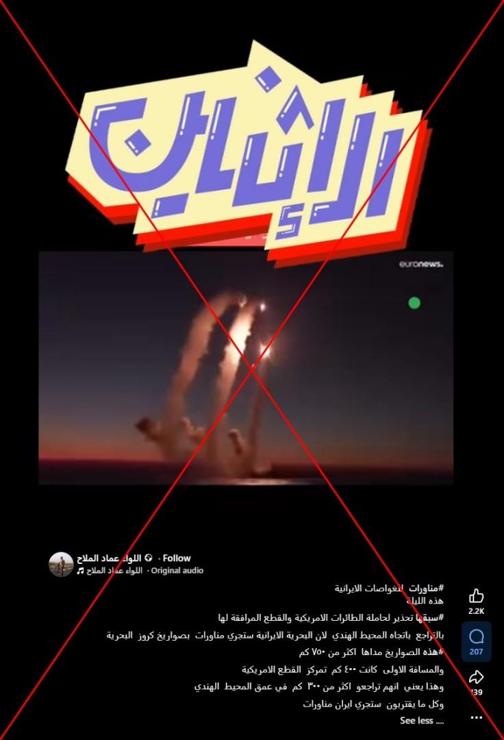 حذّر وزير الخارجية الإيراني عباس عراقجي في 28 كانون الثاني/يناير من أن بلاده ستردّ فوراً وبقوة على أي عملية عسكرية أميركية، بعدما قال الرئيس الأميركي دونالد ترامب إن الوقت ينفد لتفادي سيناريو مماثل. في هذا السياق تداول مستخدمون لمواقع التواصل الاجتماعي فيديو زعم نشاروه أنّه لمناورة عسكريّة بحريّة إيرانيّة، إلا أنّ الفيديو في الحقيقة يظهر إطلاق صواريخ من غواصة روسيّة باتجاه أوكرانيا عام 2022.