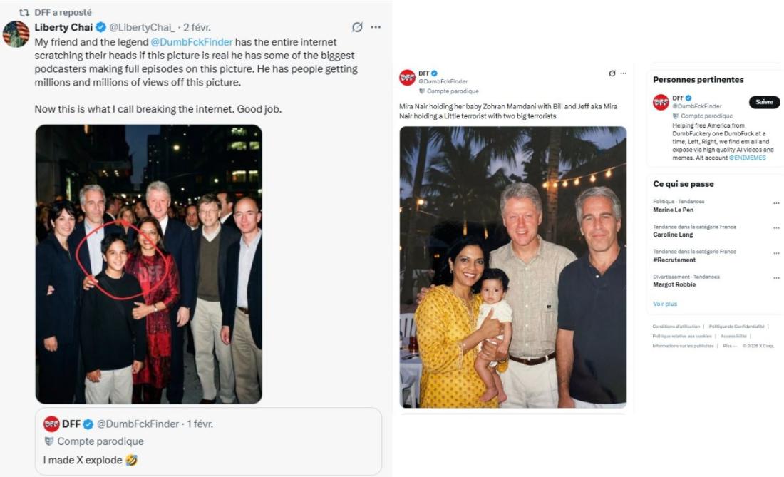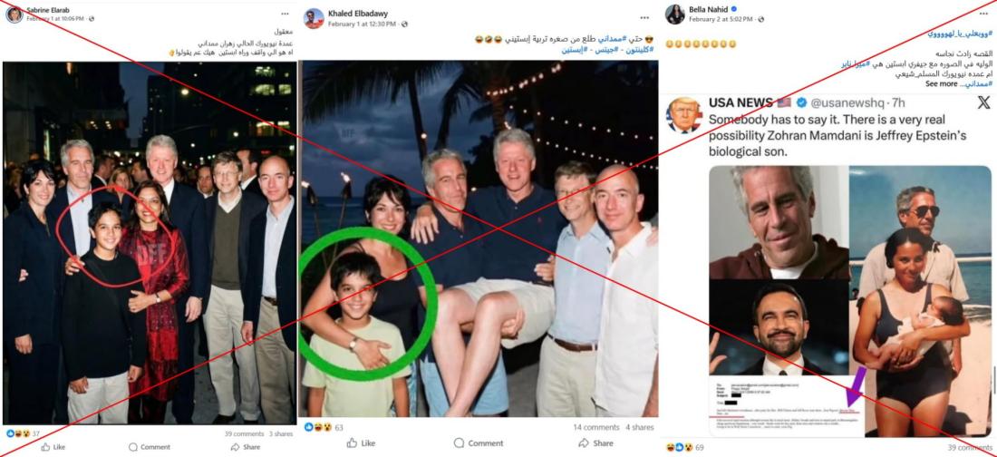 بعد أن نشرت وزارة العدل الأميركية في 30 كانون الثاني/يناير دفعة جديدة من الوثائق المرتبطة بجيفري إبستين المدان بجرائم جنسية، تداول مستخدمون لمواقع التواصل الاجتماعي صوراً قيل إنها تجمع إبستين برئيس بلدية نيويورك زهران ممداني ووالدته المخرجة ميرا ناير. إلا أن هذه الصور في الحقيقة مولدة باستخدام الذكاء الاصطناعي.