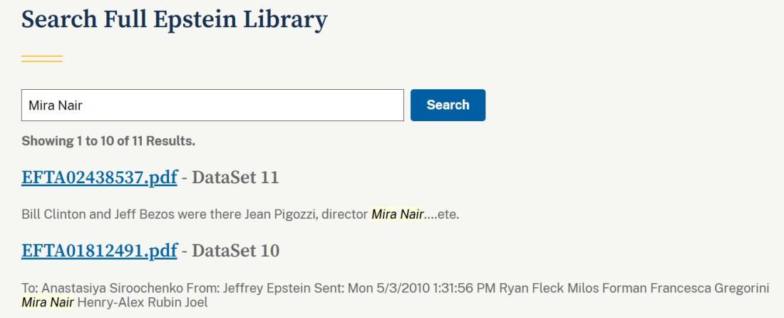 ويظهر اسمها في دعوة أُرسلت إلى جيفري إبستين لحضور أمسية مخصصة للسينما المستقلة، حيث تم إدراج ميرا ناير كعضو في لجنة التحكيم. (أرشيف)