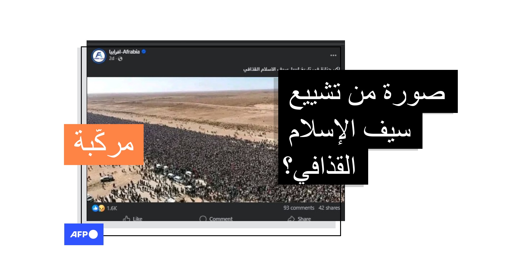 شيّع آلاف الأشخاص سيف الإسلام نجل معمر القذافي في السادس من شباط/فبراير في مدينة بني وليد في غرب ليبيا تحت حراسة أمنية مشددة. في هذا السياق، انتشرت صورة على مواقع التواصل الاجتماعي ادعى ناشروها أنها من الجنازة. صحيح أن الآلاف شيعوا سيف الإسلام إلا أن هذه الصورة عُدلت ليبدو عدد الأشخاص أكبر.