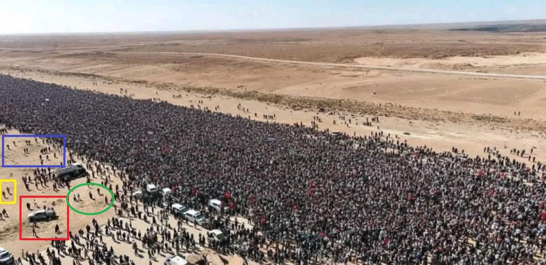 يظهر في الصورة حشد ضخم من الناس وسط ما يبدو أنها منطقة صحراوية.