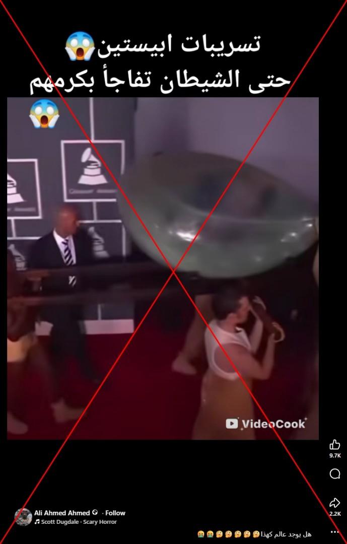 إلا أنّ الفيديو المتداول لا علاقة له بملفات إبستين، إذ يظهر في الثواني الأولى منه شعار جوائز غرامي الموسيقيّة التي تعدّ بمثابة "أوسكارات" الموسيقى الشعبية.