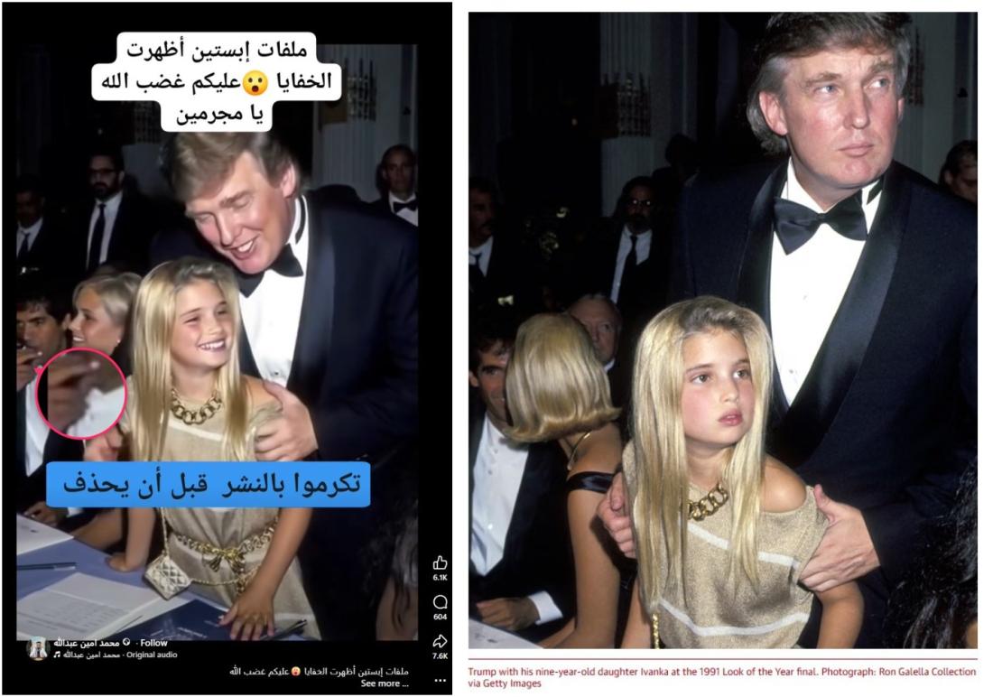 شدّد الرئيس الأميركي دونالد ترامب في 4 شباط/ فبراير على أنّه بريء من فضيحة المتمول المدان بالإتجار بالجنس جيفري إبستين، بعد ورود اسمه في الملفات التي أفرجت عنها وزارة العدل الأميركيّة. في هذا السياق تداول مستخدمون لوسائل التواصل الاجتماعي مشهداً زعم ناشروه أنه لترامب مع قاصر في جزيرة إبستين، إلا أن المشهد يظهر ترامب مع ابنته إيفانكا في احتفالٍ عام 1991.