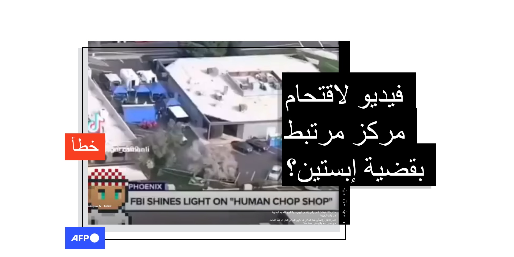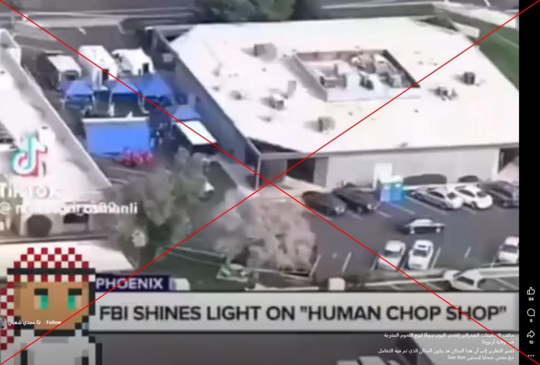 في ظّل الجدل العالمي حول قضية المتمول المدان بالإتجار بالجنس جيفري إبستين، تداول مستخدمون لمواقع التواصل الاجتماعي فيديو زعموا أنه لمداهمة سوقٍ لبيع اللحوم البشرية بعد الكشف عن الوثائق المرتبطة بقضيّة إبستين. إلا أن الفيديو في الحقيقة يعود لتقرير منشور عام 2019 عن مركز أبحاث بيولوجية في ولاية أريزونا بعد تورّطه في الإتجار بالجثث المخصّصة للبحث العلمي.
