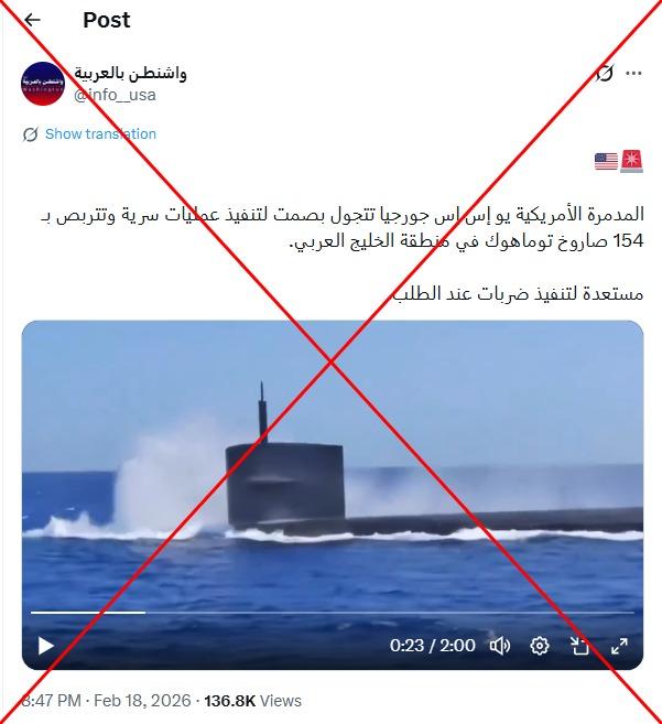 نشرت الولايات المتحدة خلال الأيام الأخيرة قوّة بحرية وجوية كبيرة في الشرق الأوسط، في إنتشار عسكري واسع قد يمهّد لحملة ضربات ضدّ إيران. في هذا السياق، تداول مستخدمون لمواقع التواصل الاجتماعي فيديو زعم ناشروه أنه لمدمرة أميركية تبحر في مياه الخليج العربي حديثاً. إلا أن الفيديو في الحقيقة يعود لغواصة أميركيّة بالقرب من سواحل هاواي عام 2021.