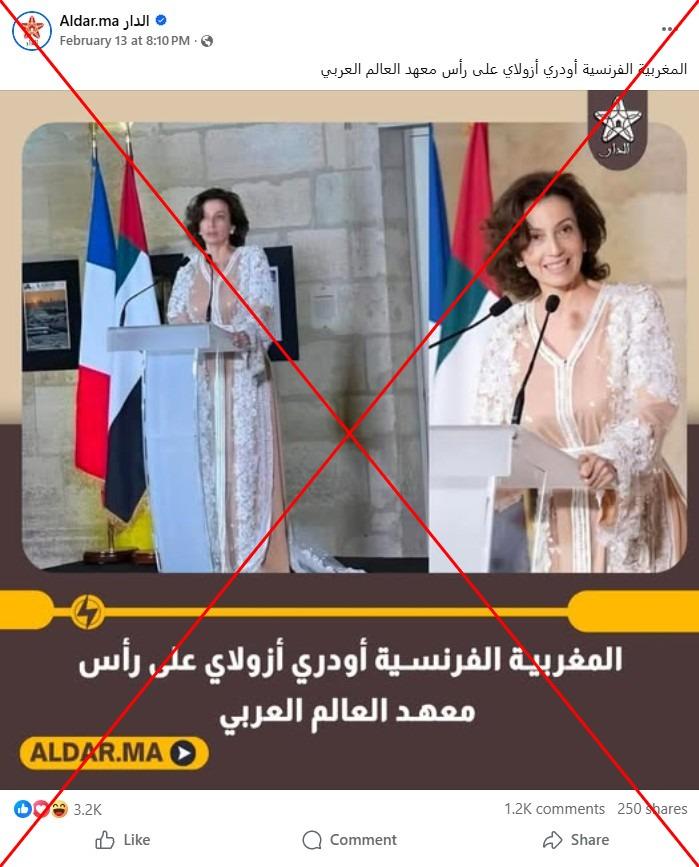 تضمّنت المنشورات خبراً مفاده أن المغربية الفرنسية أودري أزولاي عُيّنت رئيسة لمعهد العالم العربي في باريس.