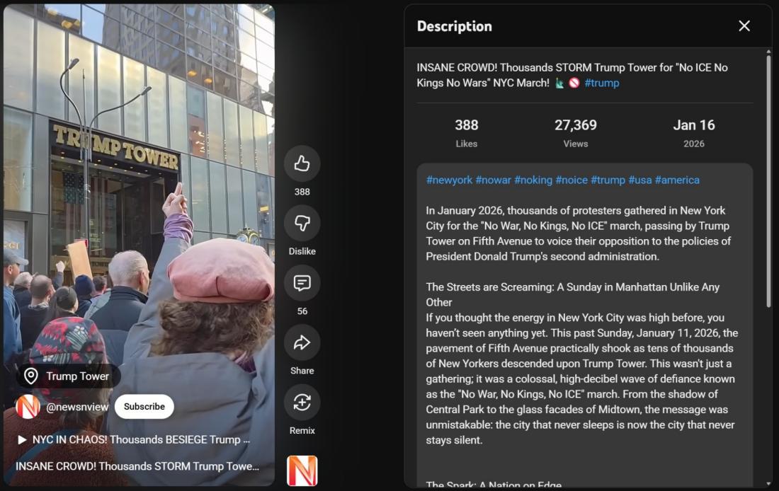 أمّا المقطع الثاني من الفيديو المتداول فيمكن العثور عليه منشوراً في كانون الثاني/يناير 2026 على موقع يوتيوب، مع الإشارة إلى أنه يصوّر مرور تظاهرة تحت شعار "لا للملوك" من أمام برج ترامب في نيويورك. (أرشيف)