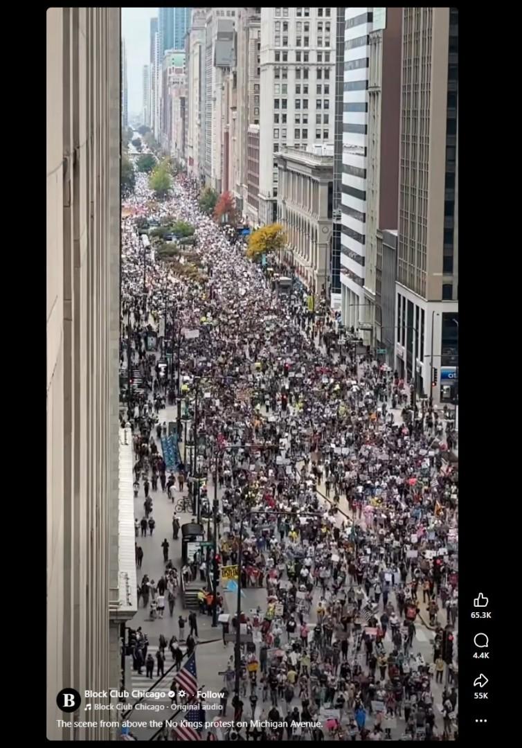وأشار الحساب إلى أن المشهد من احتجاجات تحت شعار "لا للملوك" في مدينة شيكاغو الأميركية.