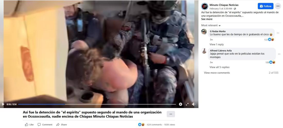 عقب مقتل زعيم كارتل "خاليسكو الجيل الجديد" المعروف بـ"إل مينتشو" في تبادل إطلاق النار مع السلطات المكسيكية في 22 شباط/فبراير، تداول مستخدمون لوسائل التواصل الاجتماعي مقطع فيديو زعم ناشروه أنه لتوقيف ابنه في ظلّ موجة من أعمال العنف الانتقامية. إلا أنّ ابن "إل مينتشو" معتقل في الحقيقة منذ العام 2015، أمّا الفيديو فيعود لتوقيف تاجر مخدرات مكسيكيّ آخر ملقب بـ"إل إسبيريتو".