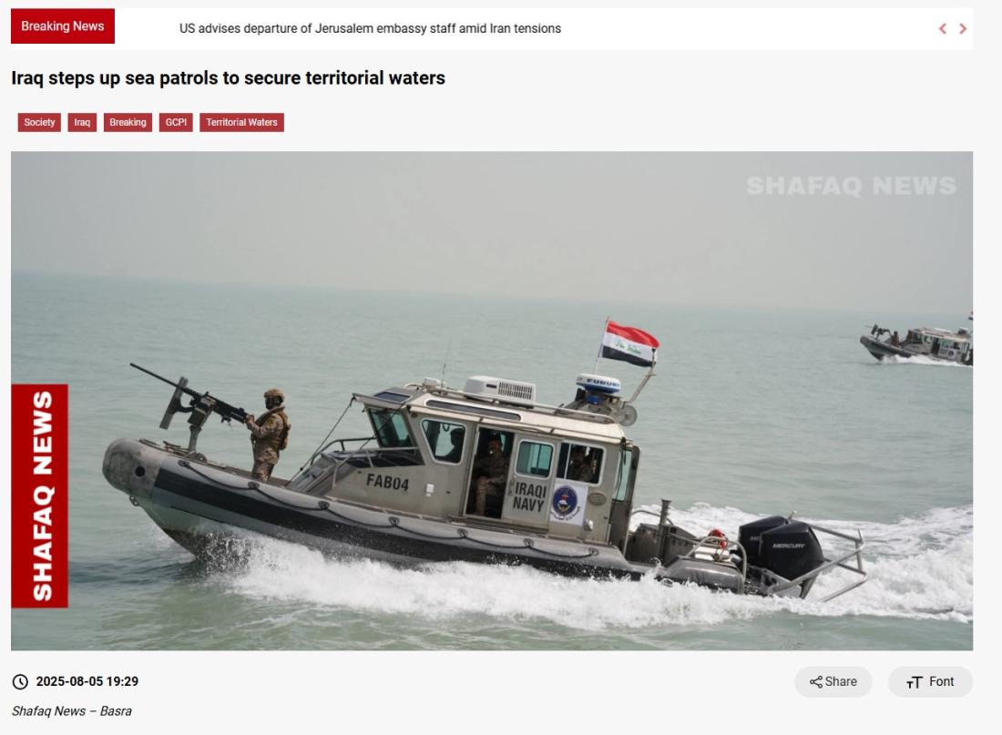 وتعود الصورة الثانية أيضاً إلى الدوريّة نفسها وقد وزّعتها وكالة فرانس برس في 5 آب/أغسطس 2025 مشيرة إلى أنّها لعملية مشتركة بين الشركة العامة لموانئ العراق والقوات البحرية لتعزيز أمن المياه الإقليمية وضمان سلامة الملاحة والتصدي لتهريب النفط.