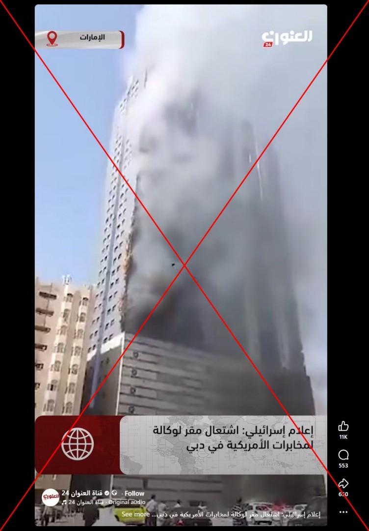 في ظلّ موجة الهجمات التي تشنّها إيران على الخليج رداً على الهجوم الأميركي الإسرائيلي والتي طالت مطارات ومرافئ وفنادق ومبان سكنية، تداول مستخدمون لمواقع التواصل الاجتماعي فيديو زعم ناشروه أنّه لاشتعال ما زعموا أنّه مقرّ لوكالة الاستخبارات الأميركيّة في دبي. إلا أنّ الفيديو في الحقيقة يعود لحريقٍ في مبنى سكنيّ في الشارقة عام 2015.