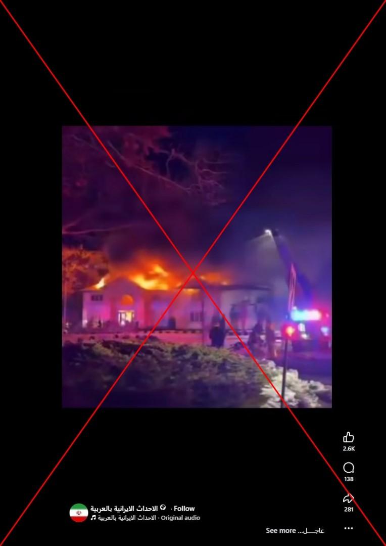 أعلن الحرس الثوري الإيراني أن صواريخه استهدفت مكتب رئيس الوزراء الإسرائيلي بنيامين نتانياهو ومقر قائد القوات الجوية الإسرائيلية في الثاني من آذار/مارس. في هذا السياق، تداول مستخدمون لمواقع التواصل الاجتماعي فيديو زعم ناشروه أنّه لاحتراق منزل نتانياهو. إلا أنّ الفيديو في الحقيقة يعود لحريقٍ في منزلٍ في الولايات المتحدة قبل اندلاع الحرب في الشرق الأوسط.