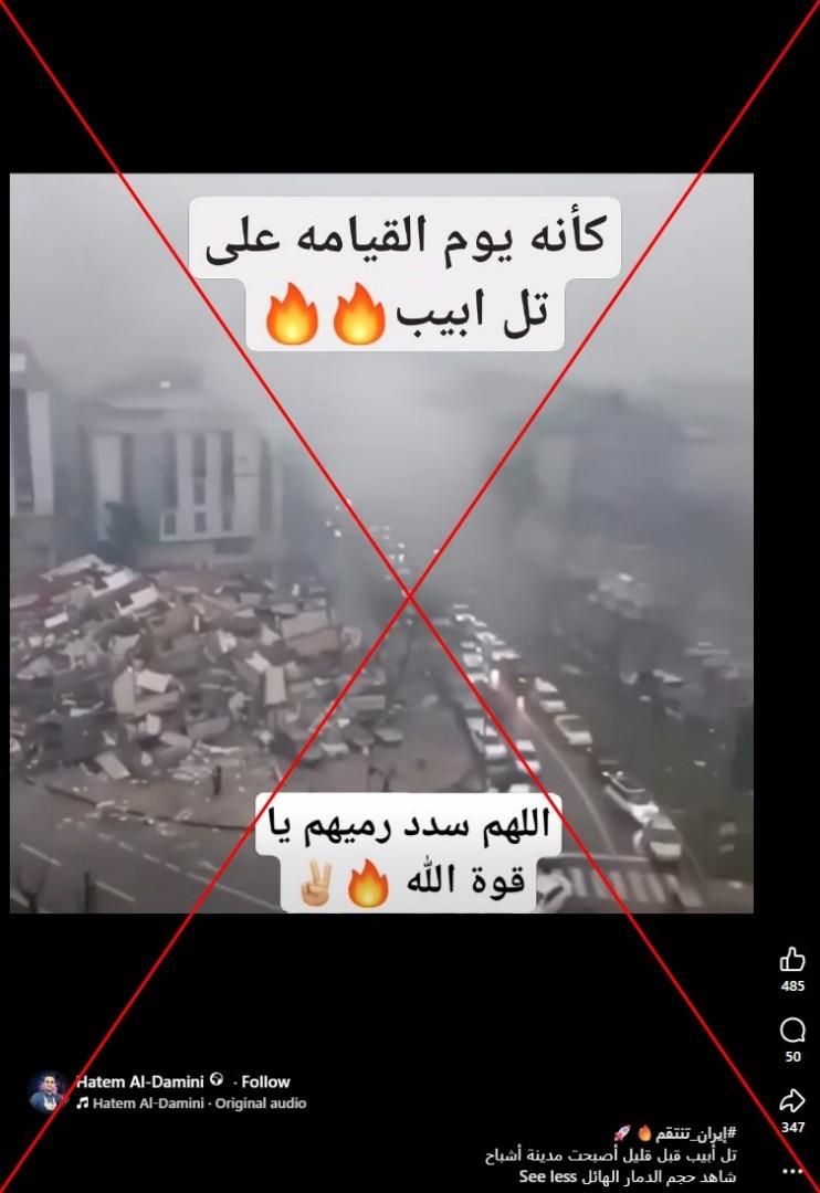 أطلقت إيران موجةً من الصواريخ باتجاه إسرائيل في 3 آذار/مارس، ما تسبب بسقوط شظايا ذخائر في منطقة تل أبيب. في هذا السياق، تداول مستخدمون لمواقع التواصل الاجتماعي فيديو زعم ناشروه أنّه لدمار كبير في منطقة تل أبيب إثر الصواريخ الإيرانية. إلا أنّ الفيديو في الحقيقة يعود للزلزال الذي ضرب منطقة كهرمان مرعش في تركيا عام 2023.