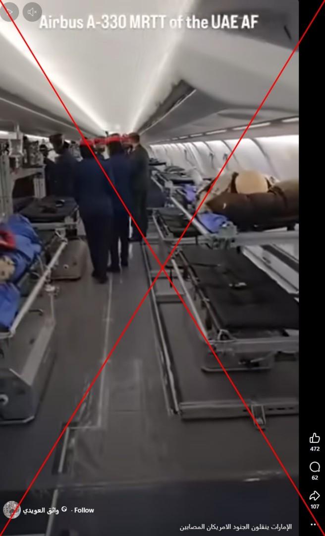 أعلنت القيادة المركزية الأميركية في 2 آذار/مارس عن ارتفاع عدد الجنود الأميركيين الذين قتلوا منذ بدء الحرب على إيران في الأيام الماضية، إلى ستة. في هذا السياق، تداول مستخدمون لمواقع التواصل الاجتماعي فيديو زعم ناشروه أنّه لإجلاء جنود أميركيين مصابين عبر طائرات إماراتية. إلا أنّ الفيديو في الحقيقة يعود لعرض طائرة إخلاء طبي خلال معرض دبي للطيران 2025.