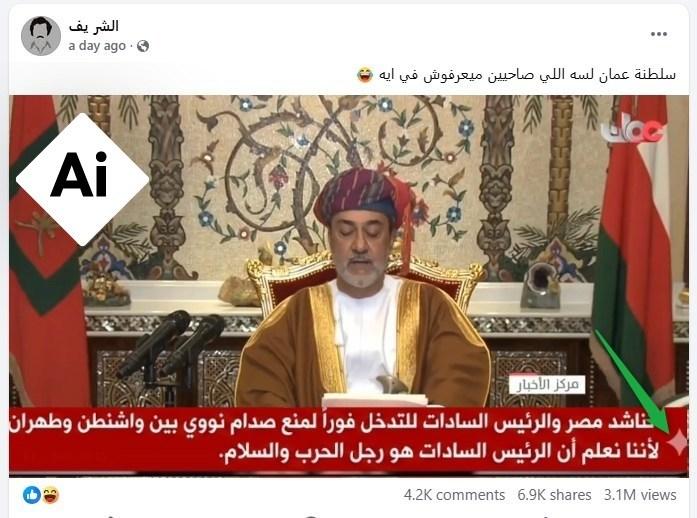 مع مواصلة طهران تنفيذ ضربات على دول خليجية رداً على الهجوم الأميركي الإسرائيلي عليها، تعرّض ميناء الدقم في سلطنة عُمان وناقلة نفط قبالة سواحلها لهجوم بمسيّرات إيرانيّة. في هذا الإطار، تداول مستخدمون لمواقع التواصل الاجتماعي فيديو زعم ناشروه أنه لكلمة ألقاها سلطان عُمان هيثم بن طارق طالب خلالها الرئيس المصري الراحل أنور السادات بالتدخل لإيقاف الحرب. إلا أن الفيديو الذي ظهر أولاً على سبيل السخرية ليس حقيقياً بل مولّداً باستخدام الذكاء الاصطناعي.