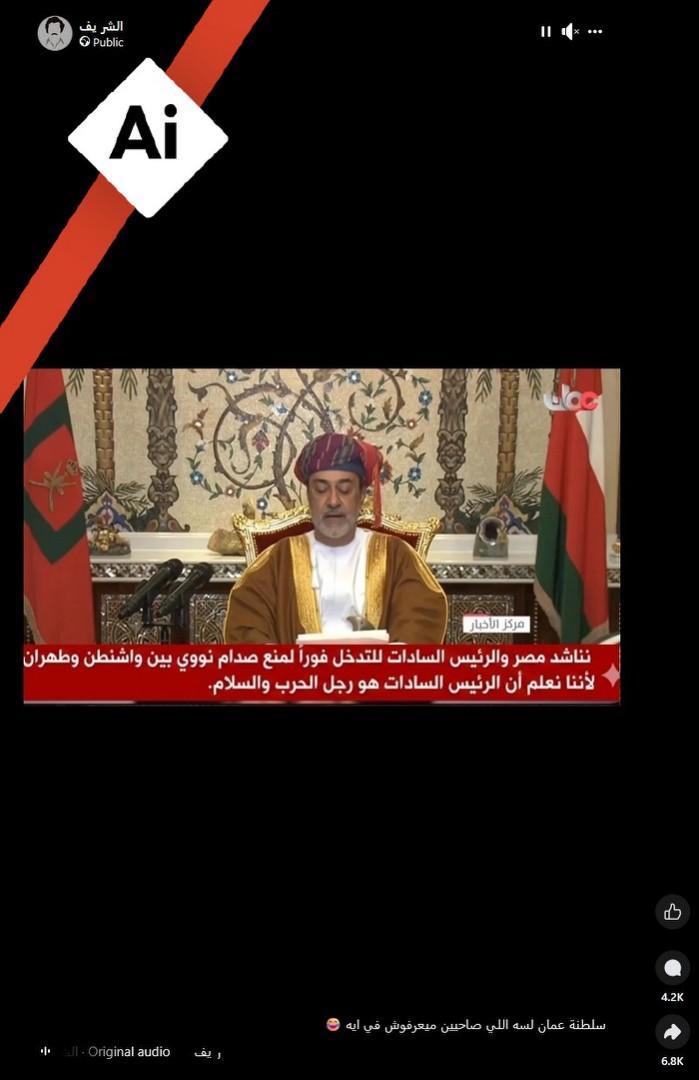 هذا الفيديو مولّد بالذكاء الاصطناعي وليس لخطابٍ لسلطان عُمان يطالب أنور السادات بالتدخل لإيقاف الحرب