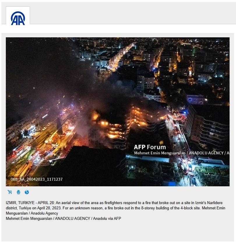 وقد نشرت وكالة الأناضول التركيّة الفيديو في 27 نيسان/أبريل عام 2023 مشيرة إلى أنّه لحريقٍ اندلع في مجمّع سكنيّ في منطقة نارليديري في ولاية إزمير التركيّة سيطرت عليه فرق الإطفاء بعد ثماني ساعات. (أرشيف 1-2)