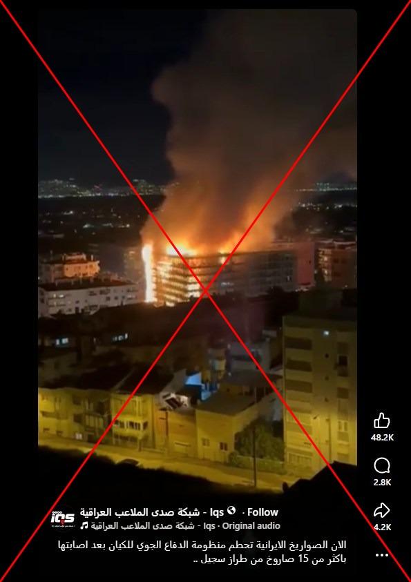 يظهر الفيديو اشتعال النيران في بناء ضخم. وجاء في التعليق المرافق "الآن الصواريخ الإيرانيّة تحطّم منظومة الدفاع الجوي في إسرائيل".