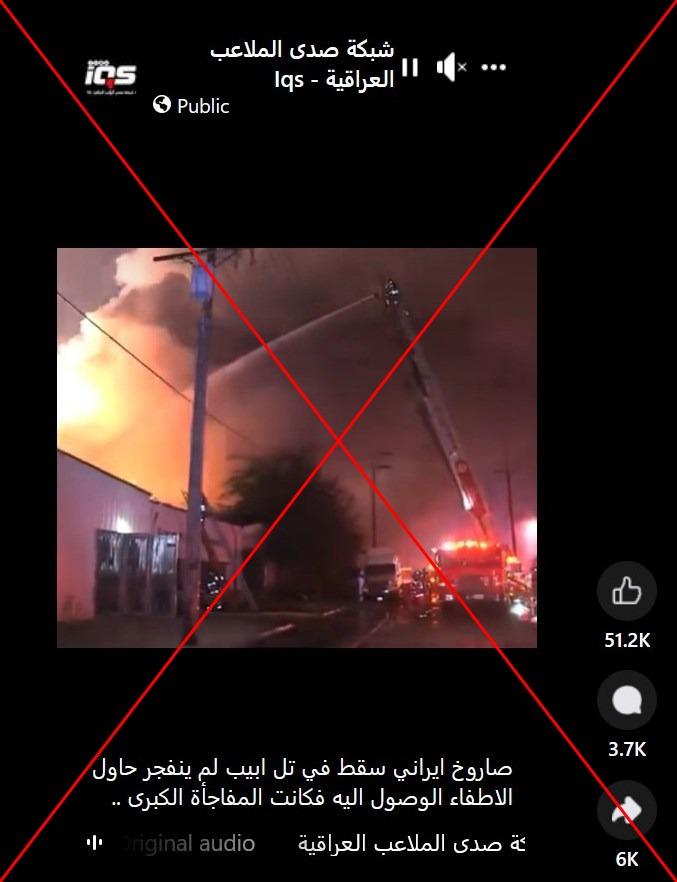 في ظلّ الهجمات الصاروخيّة الإيرانيّة المستمرّة على إسرائيل عقب شنّ الولايات المتحدة والدولة العبريّة ضربات على الجمهوريّة الإسلاميّة، تداول مستخدمون لمواقع التواصل الاجتماعي فيديو زعم ناشروه أنّه لصاروخٍ انفجر بعد سقوطه في تل أبيب. إلا أنّ الفيديو في الحقيقة يعود لحريقٍ في كاليفورنيا عام 2016.
