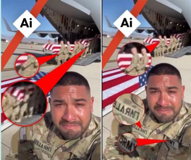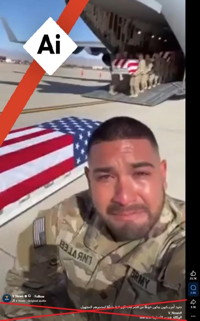 مع ارتفاع عدد الجنود الأميركيين الذين قتلوا في العمليات ضد إيران إلى 13 على الأقل، تداول مستخدمون لمواقع التواصل الاجتماعي فيديو زعم ناشروه أنّه لجنديّ أميركيّ يبكي زملاءه الذين قتلوا خلال الحرب. إلا أنّ الفيديو في الحقيقة مولّد بواسطة الذكاء الاصطناعي.