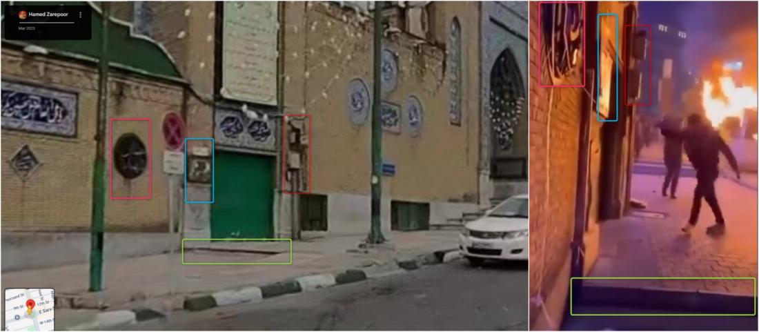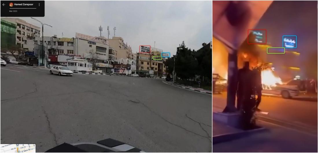 وتتطابق عناصر الفيديو منها لافتة أحد المطاعم مع ميدان كاج في طهران كما يبدو على خدمة خرائط غوغل.