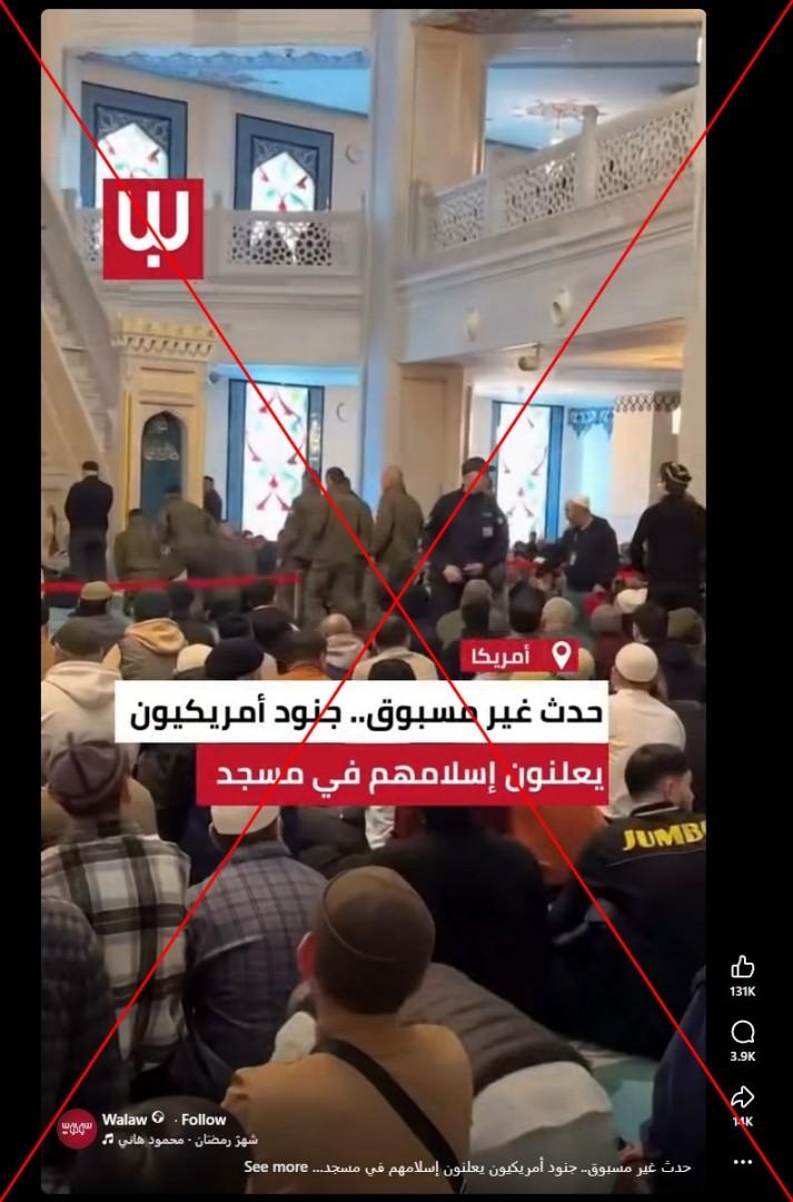 يظهر الفيديو جنوداً يدخلون مسجداً وسط المصلّين، وجاء في التعليق المرافق "حدث غير مسبوق جنود أميركيون يعلنون إسلامهم في مسجد".