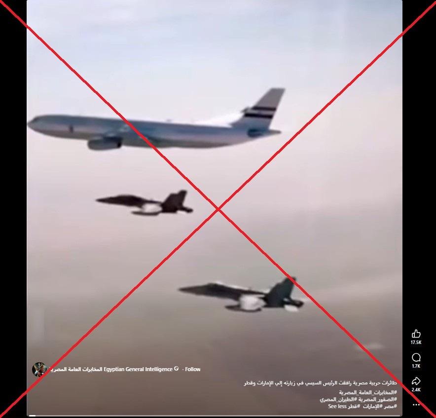وجاء في التعليق المرافق "طائرات حربية مصرية رافقت الرئيس السيسي في زيارته إلى الإمارات وقطر".