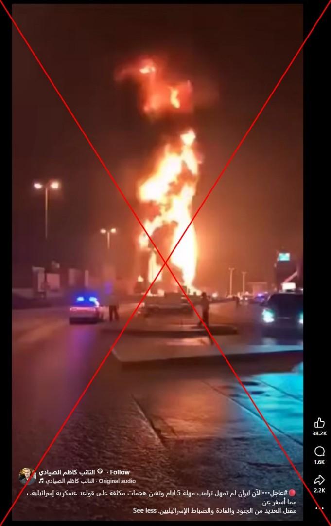 في ظلّ تهديد الرئيس الأميركي دونالد ترامب بقصف منشآت الطاقة في إيران إن لم تُعد الجمهورية الإسلامية فتح مضيق هرمز الحيوي لإمدادات النفط والغاز أمام حركة الملاحة واستمرار الهجمات الإيرانيّة على إسرائيل، تداول مستخدمون لمواقع التواصل الاجتماعي فيديو زعم ناشروه أنّه لاستهداف قاعدة عسكريّة إسرائيليّة بصواريخ إيرانيّة. إلا أنّ الفيديو في الحقيقة يعود لاحتراق أنبوب نفط في البحرين عام 2017.