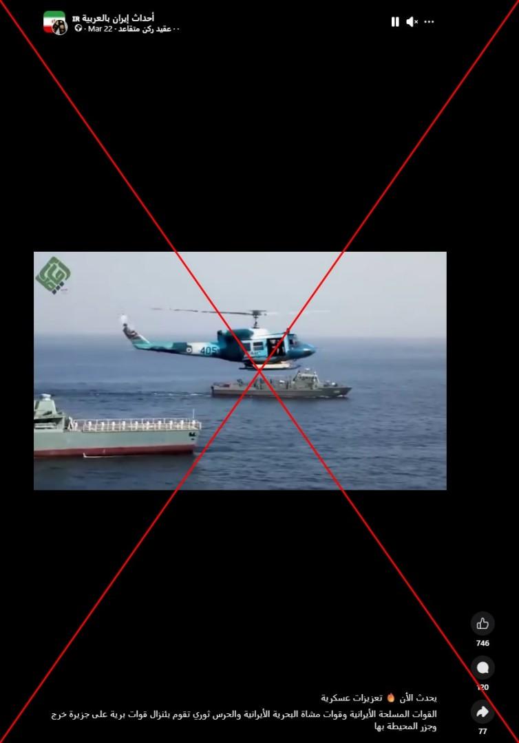 إلا أنّ الفيديو المتداول على أنه لتعزيزات إيرانيّة حديثة على جزيرة خارك يعود في الحقيقة لمناورة عسكريّة قبل سنوات.