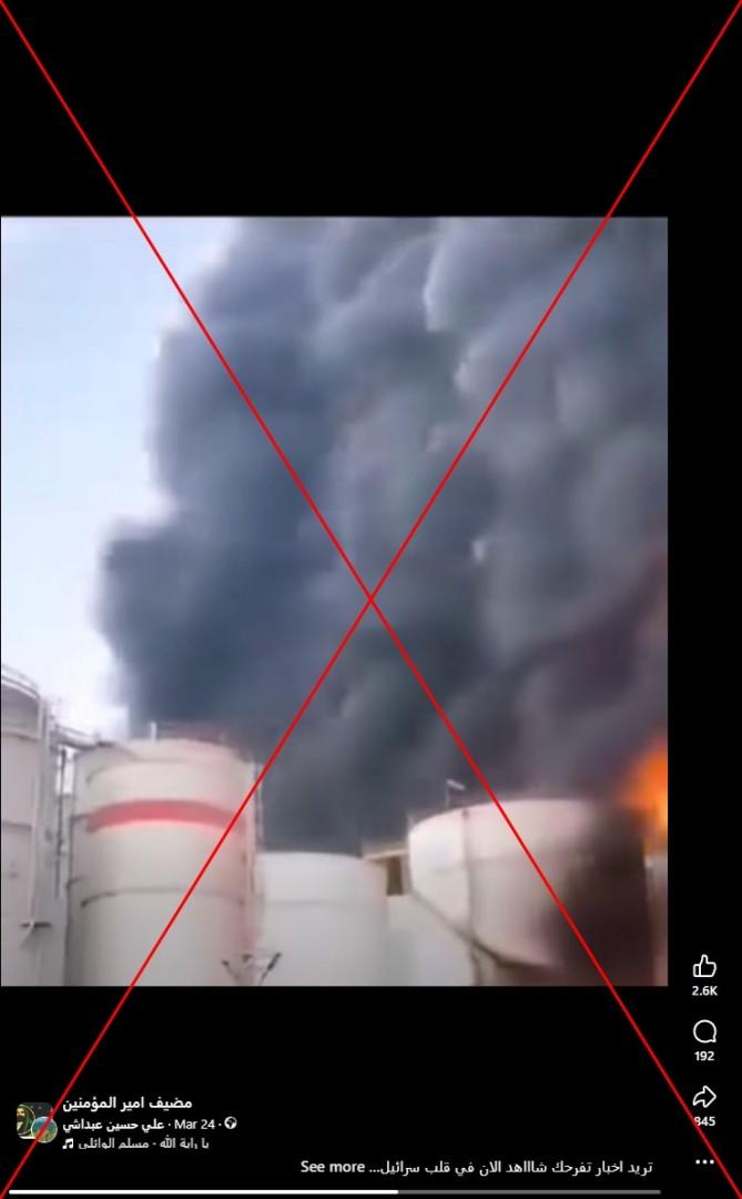 عرضت وسائل إعلام رسمية إيرانيّة في 23 آذار/مارس خرائط لمحطات كهربائية في دول المنطقة وتوعدت باستهدافها في حال نفّذ الرئيس الأميركي دونالد ترامب تهديده بقصف محطاتها ما لم يتمّ فتح مضيق هرمز. في هذا السياق، تداول مستخدمون لمواقع التواصل الاجتماعي فيديو زعم ناشروه أنه لقصف محطات نفطية في إسرائيل. إلا أنّ الفيديو يعود في الحقيقة لحريق في شركة للبتروكيماويات في الإمارات عام 2025.