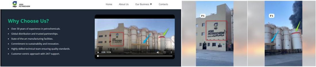 بالإضافة إلى ذلك، يمكن مطابقة عناصر الفيديو، الذي يظهر فيه شعار شركة "آسيا بتروكيم"، مع صورة منشورة على الموقع الرسمي للشركة. (أرشيف)