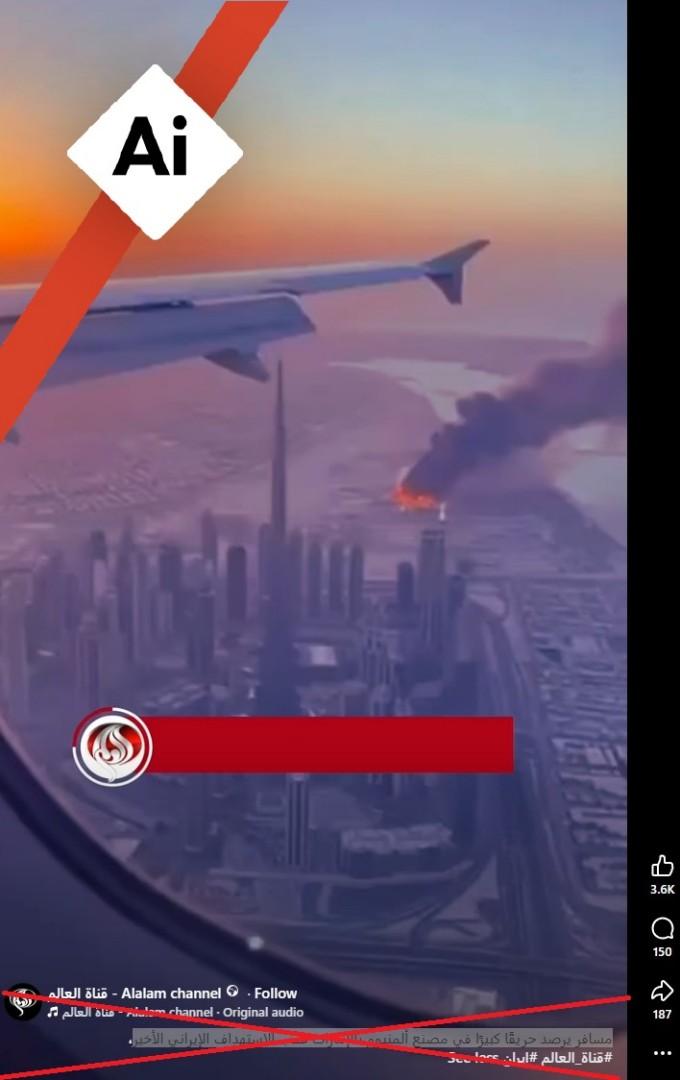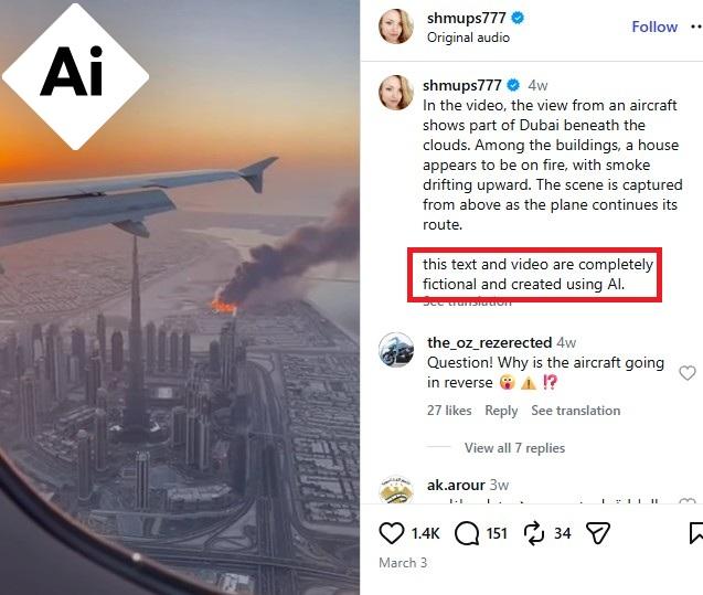 وجاء في التعليق المرافق أن المشهد مُنشأ بواسطة الذكاء الاصطناعي لمحاكاة حريق مفترض في دبي.