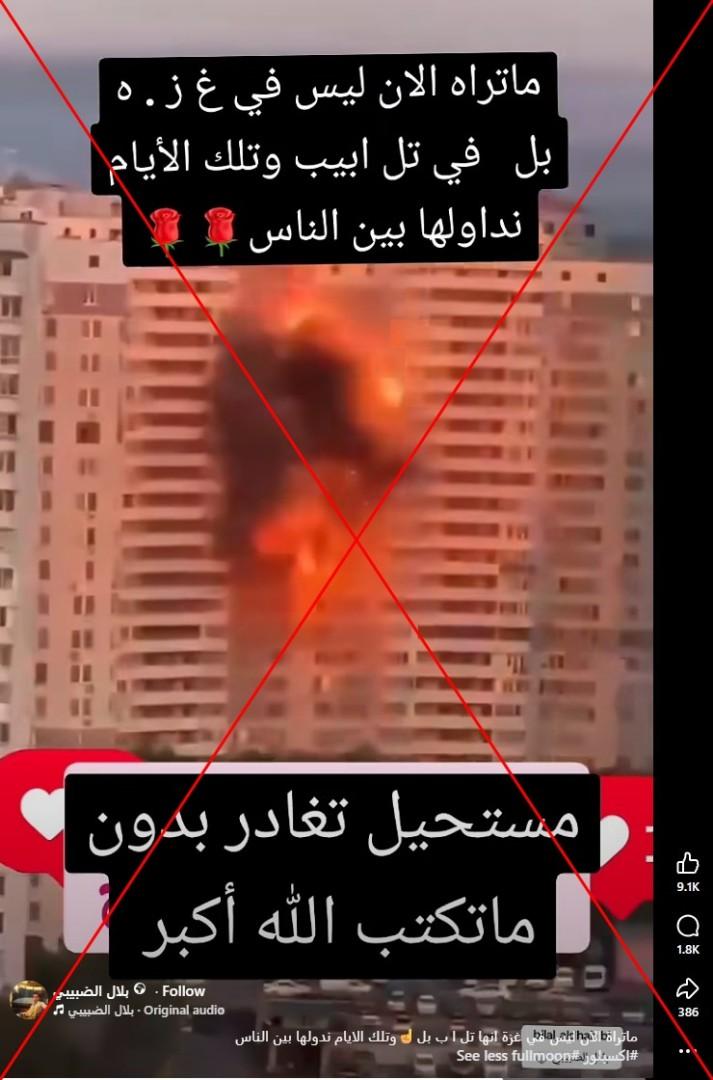 يُظهر الفيديو ما يبدو أنه صاروخ استهدف شققاً داخل مبنى سكني، وجاء في التعليق المرافق "ما تراه الآن ليس في غزة إنها تل أبيب".