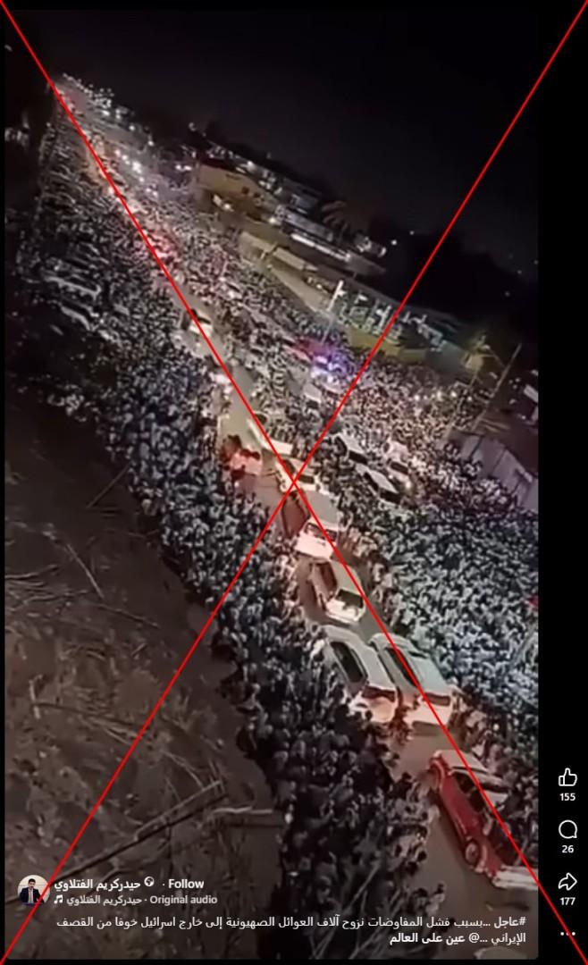 وجاء في التعليق المرافق "نزوح آلاف العائلات إلى خارج إسرائيل بسبب فشل المفاوضات خوفاً من القصف الإيراني".