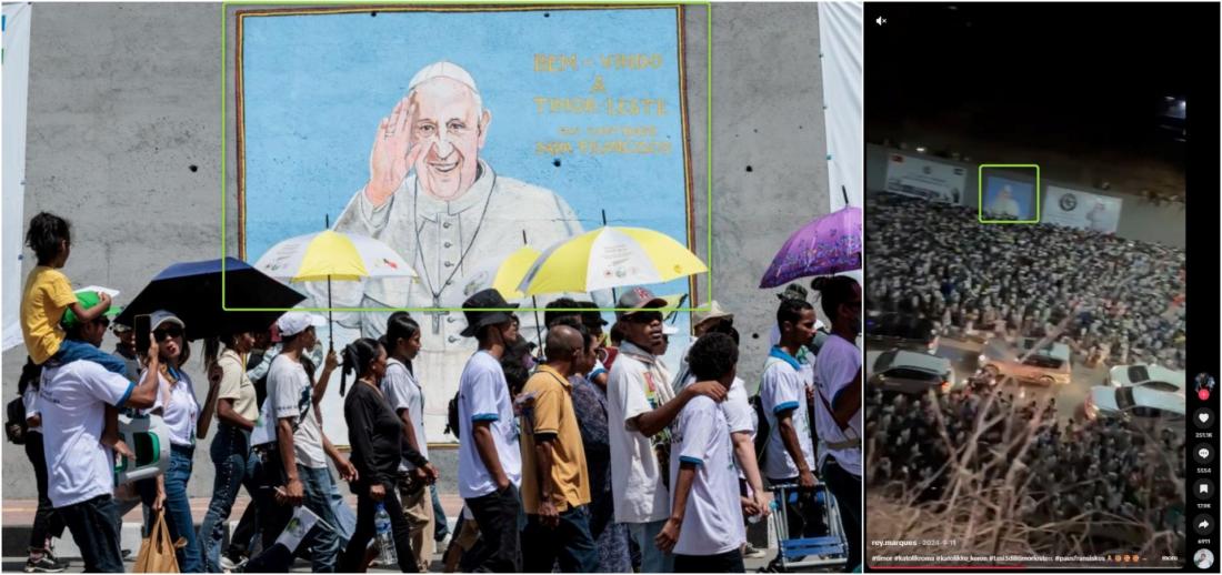 وأظهر التفتيش عنه بعد تقطيعه إلى مشاهد ثابتة أنه منشور على موقع تيك توك بتاريخ 11 أيلول/سبتمبر 2024 مع الإشارة إلى أنّه للحشود التي استقبلت البابا الراحل فرنسيس في تيمور الشرقيّة. (أرشيف)