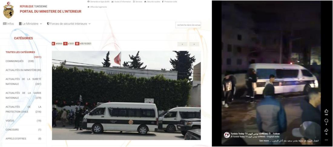 وفي هذه المقاطع الأكثر وضوحاً يمكن ملاحظة سيارة إسعاف كتلك المعتمدة في تونس.