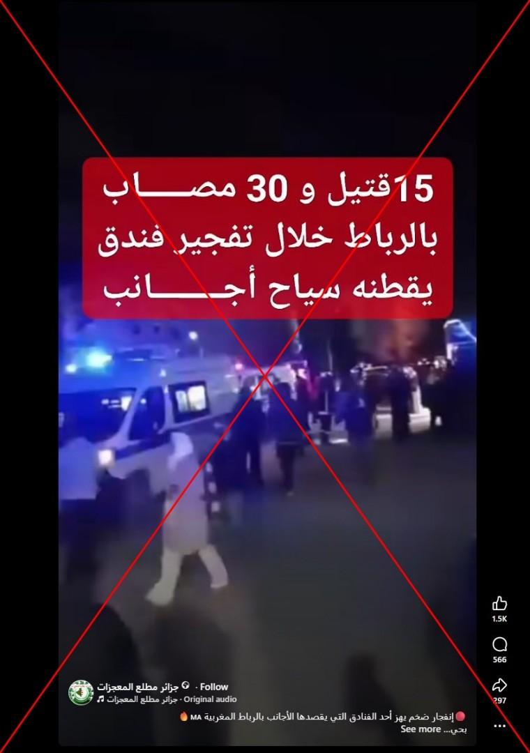 وجاء في التعليق المرافق "15 قتيلاً و30 مصاباً في تفجير فندقٍ في الرباط".